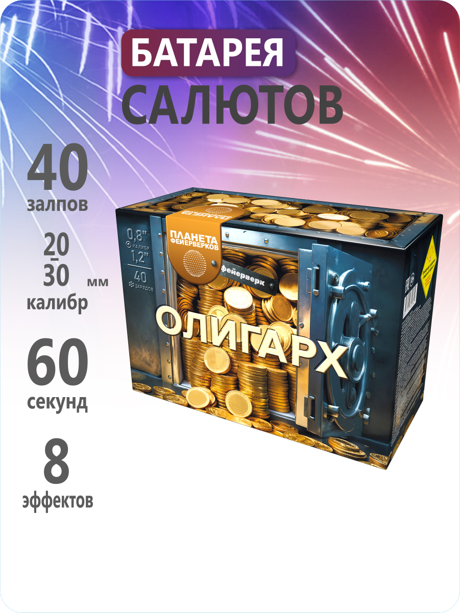 Веерный фейерверк «Олигарх»: роскошное пиротехническое шоу для избранных моментов жизни. Представляем впечатляющее зрелище, способное подчеркнуть значимость любого торжества. Разнокалиберные заряды калибра от 0,8 до 1,2 дюйма создают феерию света и цвета на высоте до 40 метров. Длительность шоу — 60 секунд незабываемых впечатлений. «Олигарх» — фейерверк, который говорит без слов: «Это будет незабываемо!»