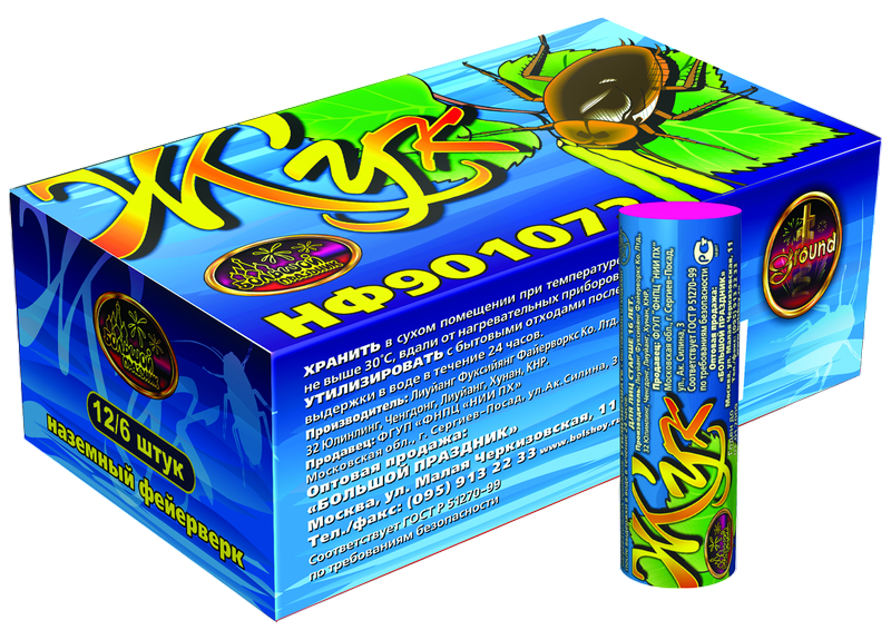 Вращается на земле, разбрасывает зеленые, красные, золотые искры.